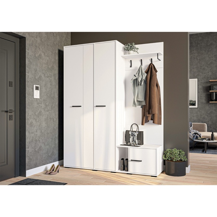 - Современный дизайн: белый оттенок визуально расширяет пространство и наполняет его светом. Лаконичные формы прихожей создают ощущение лёгкости и гармонично вписываются в любой интерьер.